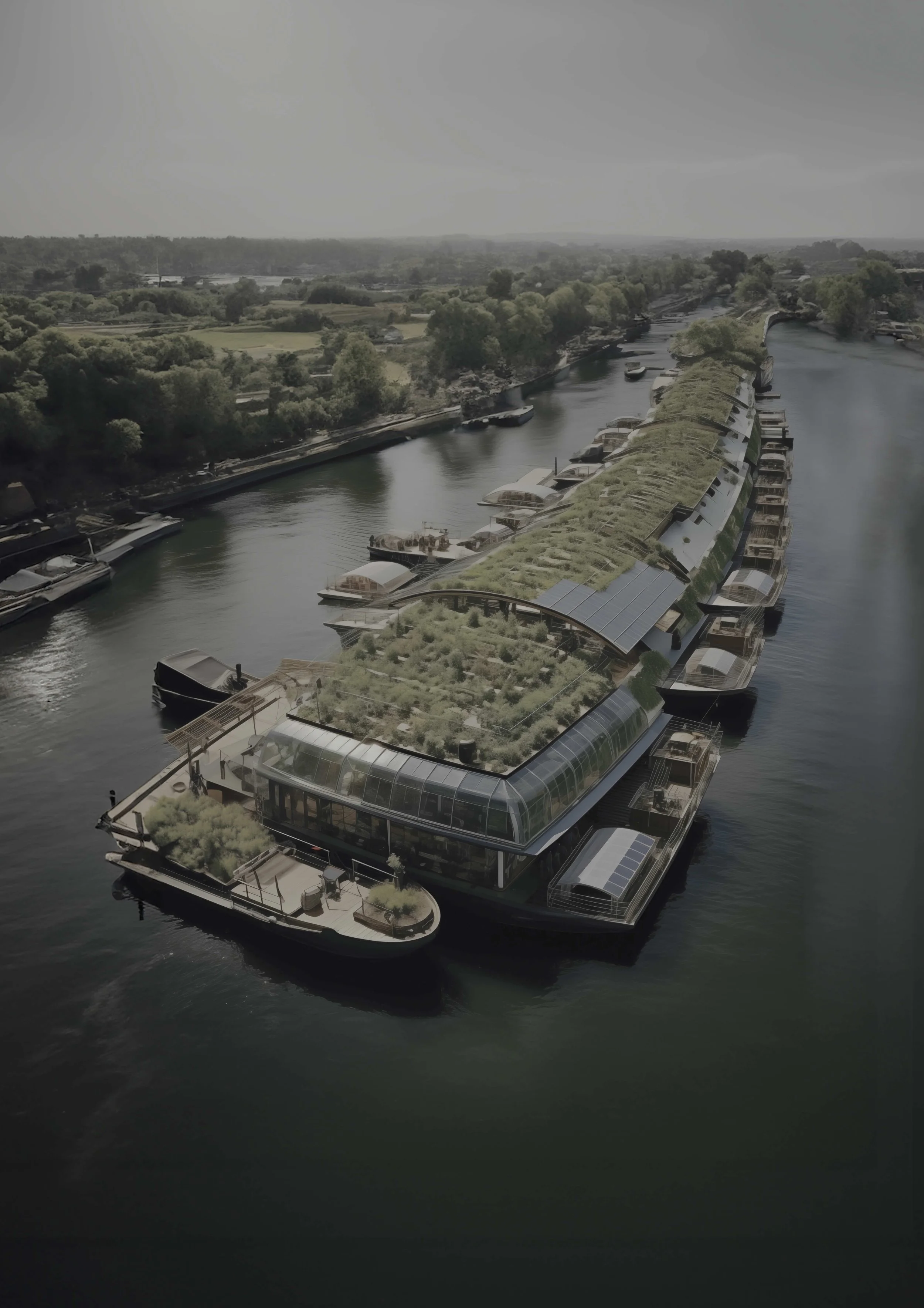 Regenerative and self-sufficient Modular Barge Unit complete with a Rainwater Harvesting System, Solar Panels, Compost Facilities and Gardens