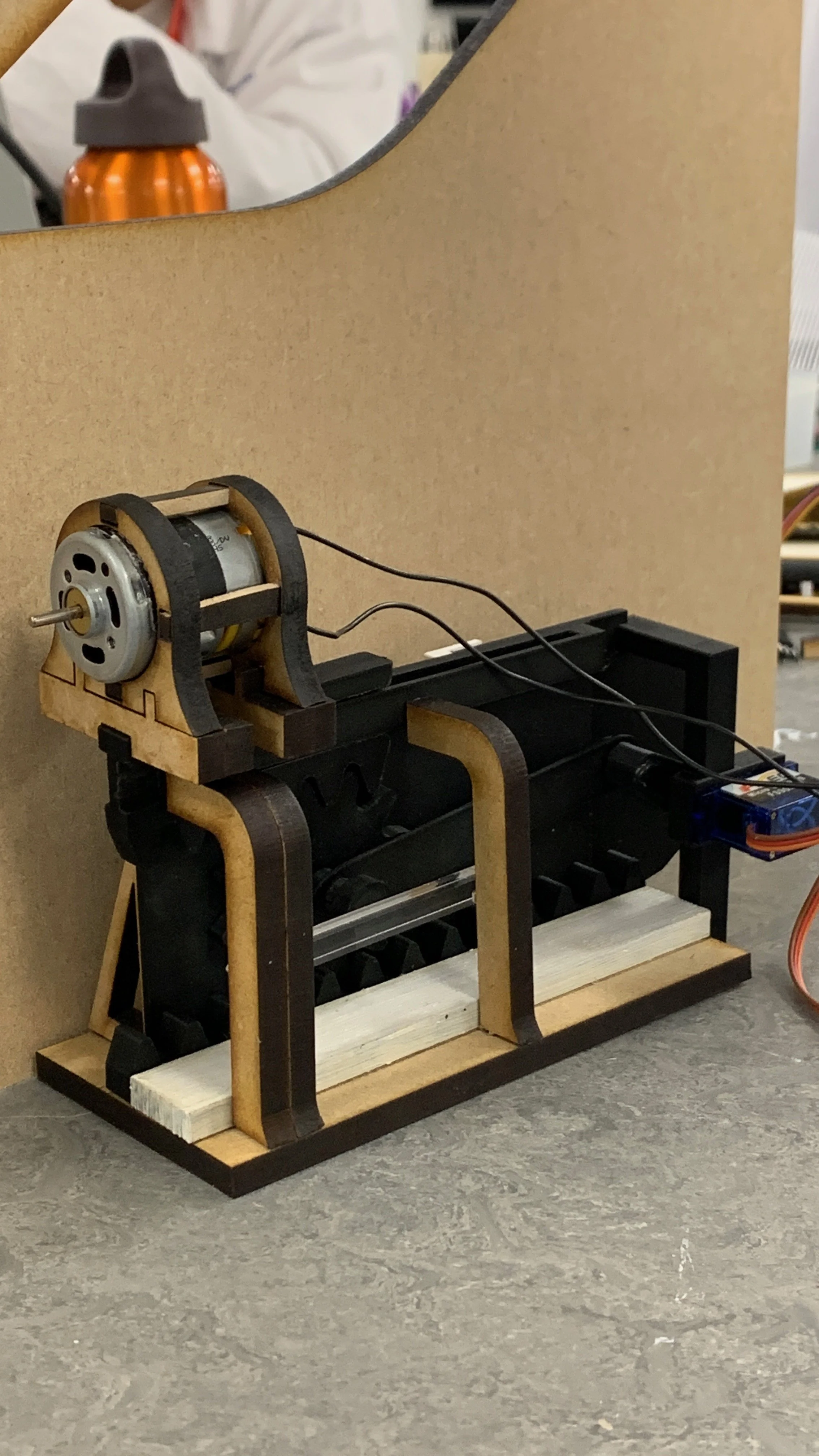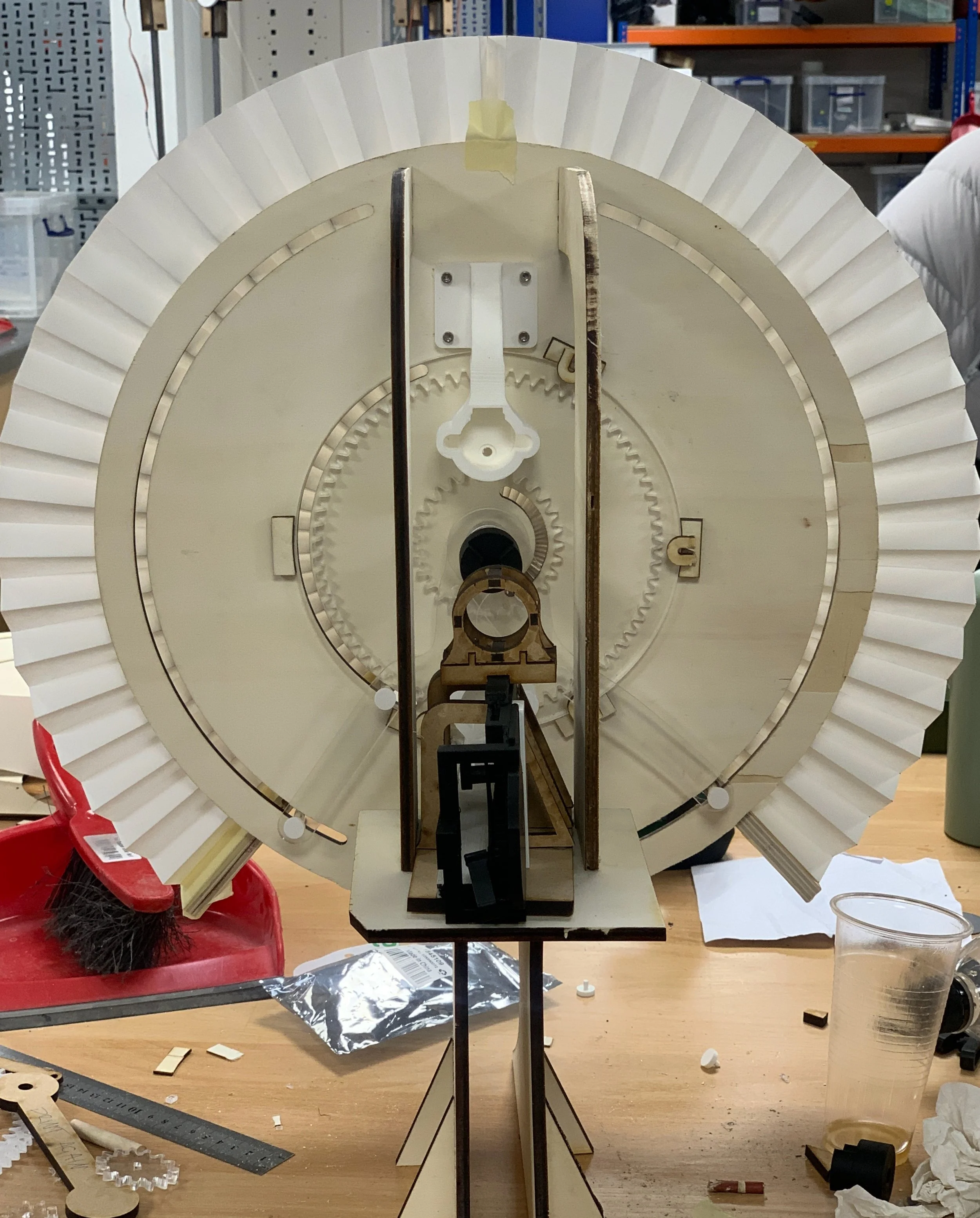 Gesture-responsive kinetic installation that translates the shift between calm and chaotic breathing into motion. At the heart of this piece is a double pendulum, a naturally chaotic system that never produces the outcome twice. When distraction sets in, the sculpture retracts its accordion backdrop and rotates its dial in a steady, predictable path, guiding the viewer back to a calmer state. As breathing steadies, the backdrop expands and the pendulum returns to its unpredictable dance, offering a view that can never be replicated, inviting the viewer to be truly present. This continuous cycle of change turns mindfulness into a tangible, ever-evolving experience.