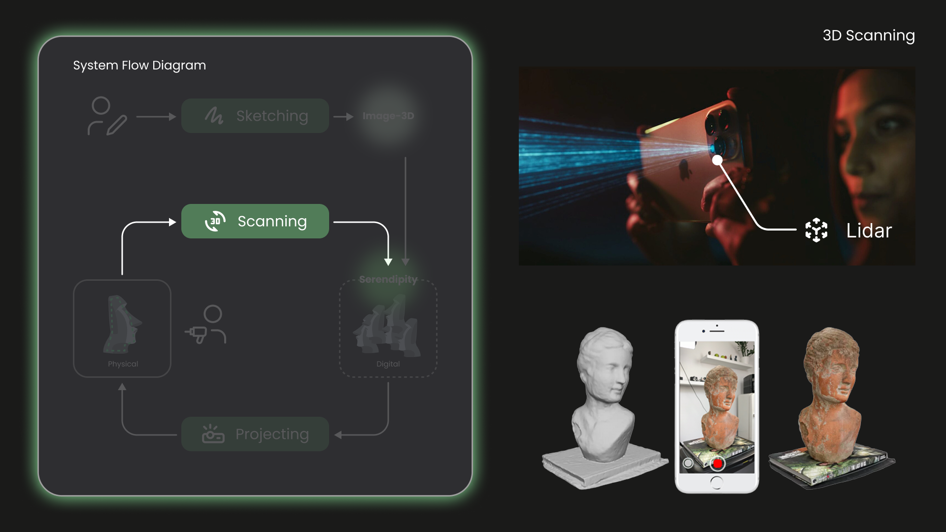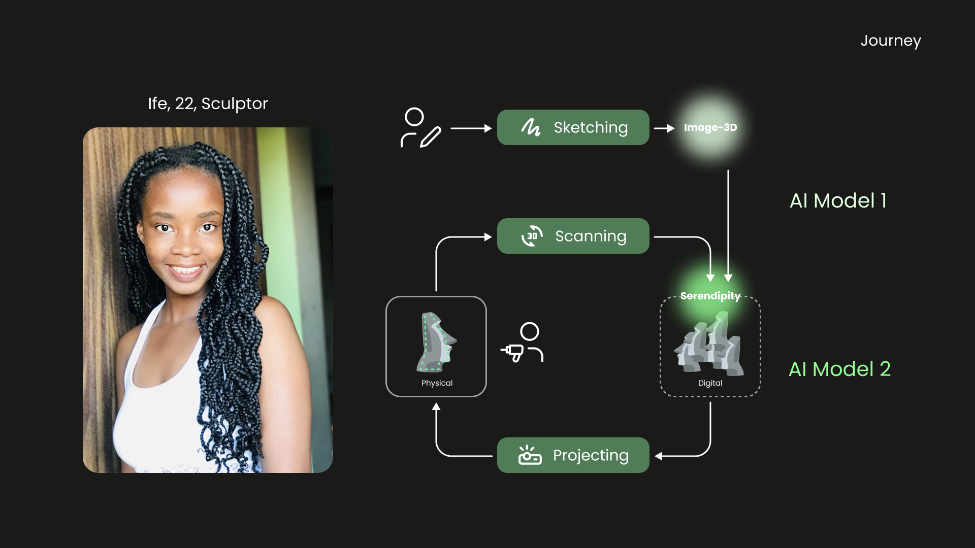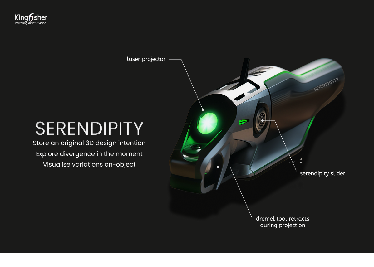 Serendipity is a speculative AI-powered handheld tool that augments the creative health of artists. Using cutting-edge Dynamic Projection technology, this new class of tool allows artists, especially sculptors, to incorporate AI as a creative co-pilot by being able to visualise variations on work surfaces without breaking the creative flow. Project delivered in collaboration with Kingfisher PLC to re-imagine the future of power tools.